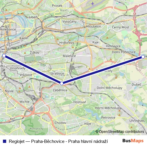 The first stop of the Regiojet rail route is Praha-Běchovice and the last stop is Praha hlavní nádraží. Regiojet (Praha-Běchovice - Praha hlavní nádraží) is operational during everyday.