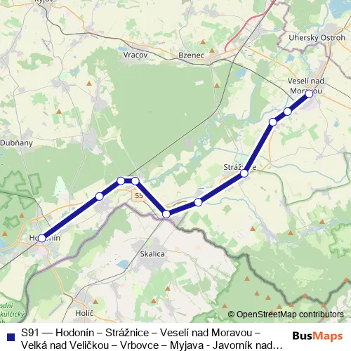 Rail S91 - Hodonín – Strážnice – Veselí nad Moravou – Velká nad Veličkou – Vrbovce – Myjava - Javorník nad Veličkou zastávka - Hodonín Schedule in Skalica
