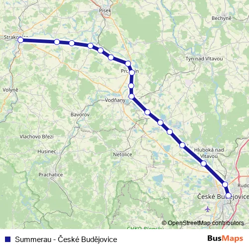 The first stop of the Summerau - České Budějovice rail route is České Budějovice and the last stop is Strakonice. Summerau - České Budějovice (Summerau - České Budějovice) is operational during everyday.