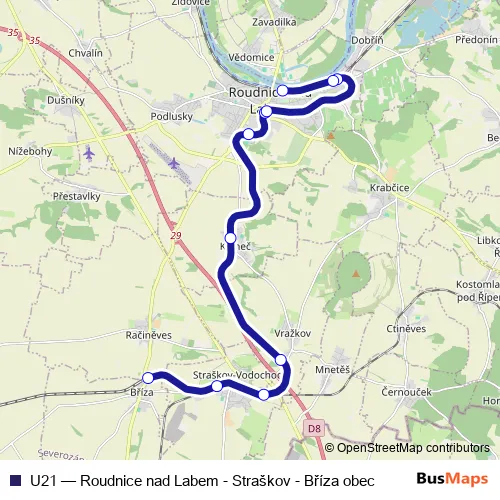 The first stop of the U21 rail route is Bříza obec and the last stop is Roudnice nad Labem. U21 (Roudnice nad Labem - Straškov - Bříza obec) is operational during everyday.