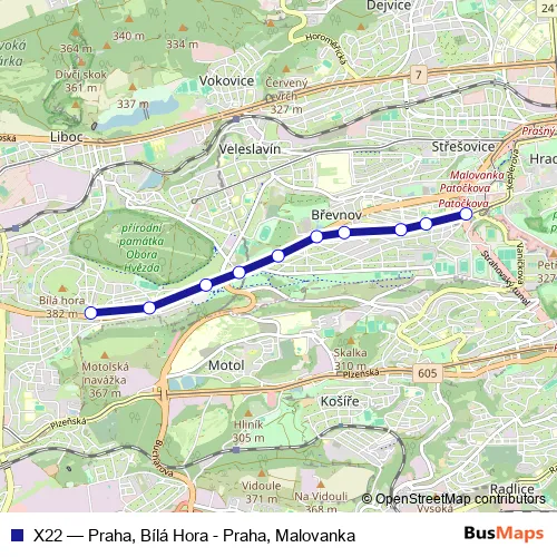 The first stop of the X22 bus route is Praha, Malovanka and the last stop is Praha, Bílá Hora. X22 (Praha, Bílá Hora - Praha, Malovanka) is operational during everyday.