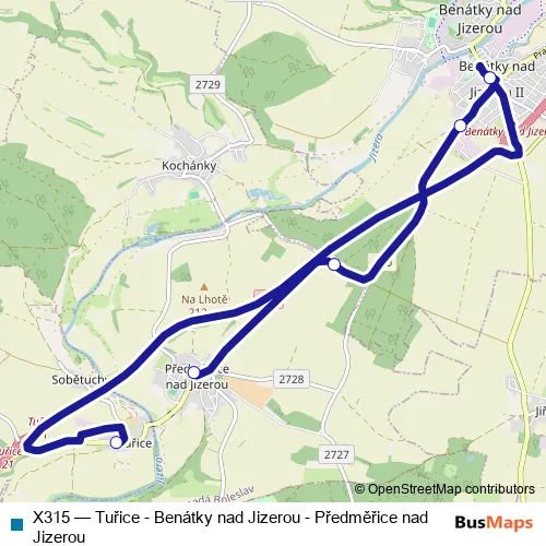The first stop of the X315 bus route is Tuřice and the last stop is Předměřice n.Jiz.. X315 (Tuřice - Benátky nad Jizerou - Předměřice nad Jizerou) is operational during on weekdays.