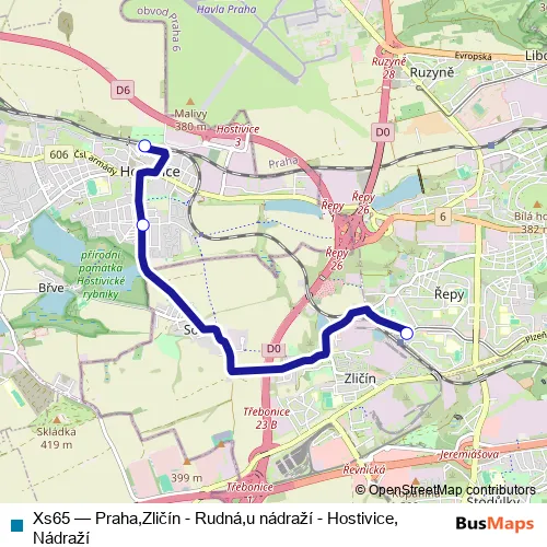 The first stop of the Xs65 bus route is Sídliště Řepy and the last stop is Hostivice,Nádraží. Xs65 (Praha,Zličín - Rudná,u nádraží - Hostivice,Nádraží) is operational during everyday.
