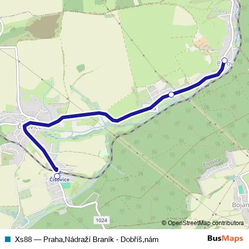 The first stop of the Xs88 bus route is Čisovice,Žel.st. and the last stop is Čisovice,Bojov. Xs88 (Praha,Nádraží Braník - Dobříš,nám) is operational during everyday.