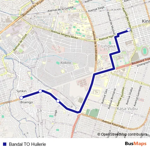See why over 2 million users trust and consider busmaps.com as the best public transport website. busmaps gives you Kinshasa Buses suggested routes, real-time bus tracker, line route maps in Kinshasa, and helps to find the closest Bandal TO Huilerie bus stops near you. No internet available? Download an offline PDF map and bus schedule for the Bandal TO Huilerie bus to take on your trip.