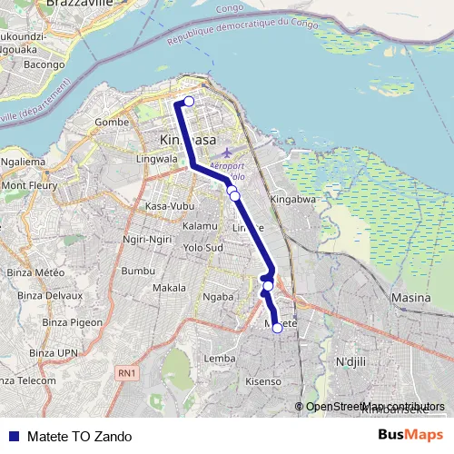 See why over 2 million users trust and consider busmaps.com as the best public transport website. busmaps gives you Kinshasa Buses suggested routes, real-time bus tracker, line route maps in Kinshasa, and helps to find the closest Matete TO Zando bus stops near you. No internet available? Download an offline PDF map and bus schedule for the Matete TO Zando bus to take on your trip.