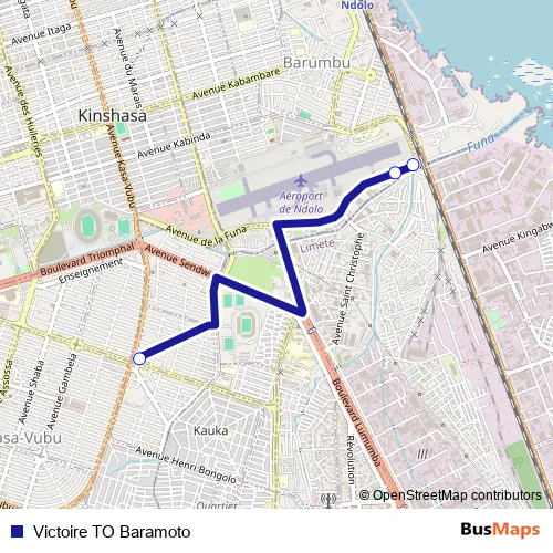 See why over 2 million users trust and consider busmaps.com as the best public transport website. busmaps gives you Kinshasa Buses suggested routes, real-time bus tracker, line route maps in Kinshasa, and helps to find the closest Victoire TO Baramoto bus stops near you. No internet available? Download an offline PDF map and bus schedule for the Victoire TO Baramoto bus to take on your trip.