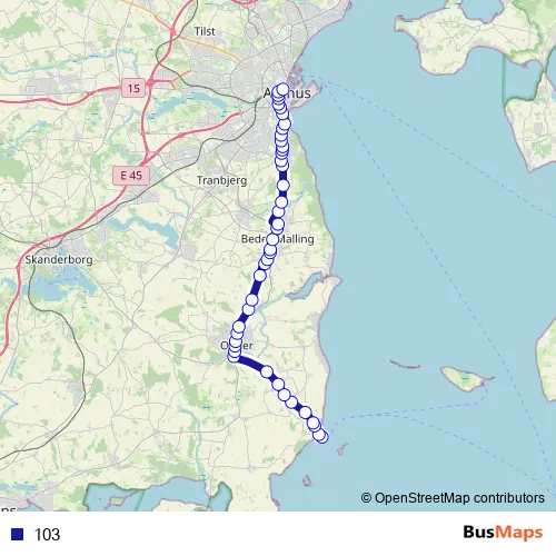 The first stop of the 103 bus route is Hou Havn (Odder Kom) and the last stop is Aarhus Rutebilstation/Sønder Allé. 103 is operational during everyday.