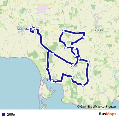 The first stop of the 269e bus route is Ebberup Skole (Assens Kommune) and the last stop is