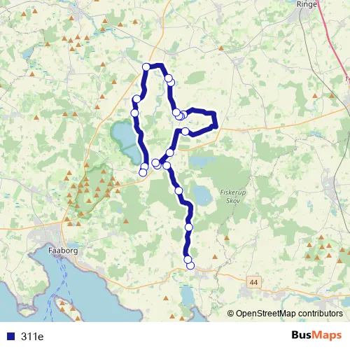 The first stop of the 311e bus route is Bøgebjergskolen (Faaborg Midtfyn) and the last stop is