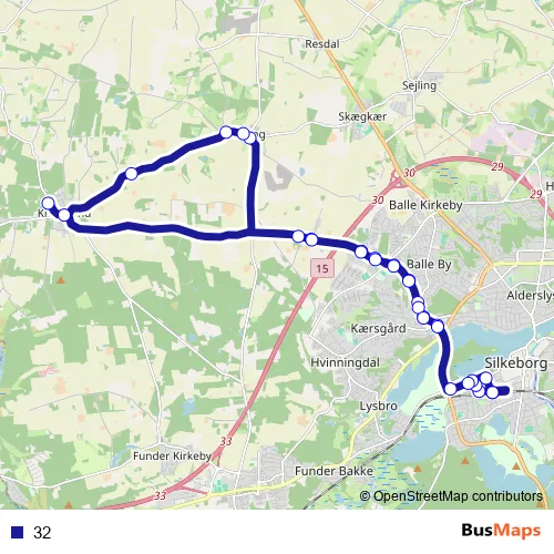 The first stop of the 32 bus route is Silkeborg Trafikterminal and the last stop is Silkeborg Trafikterminal. 32 is operational during everyday.