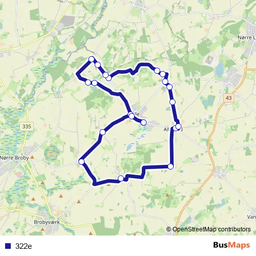 The first stop of the 322e bus route is Allested-Vejle Skole (Faaborg Midtfyn) and the last stop is