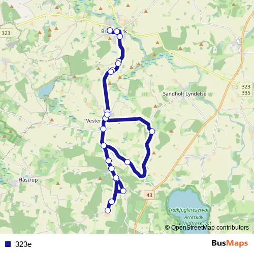 The first stop of the 323e bus route is Pontoppidanskolen (Faaborg Midtfyn) and the last stop is