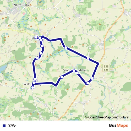 The first stop of the 325e bus route is Pontoppidanskolen (Faaborg Midtfyn) and the last stop is