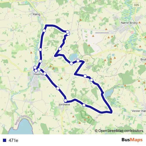 The first stop of the 471e bus route is Haarby Rtb. (Assens Kommune) and the last stop is