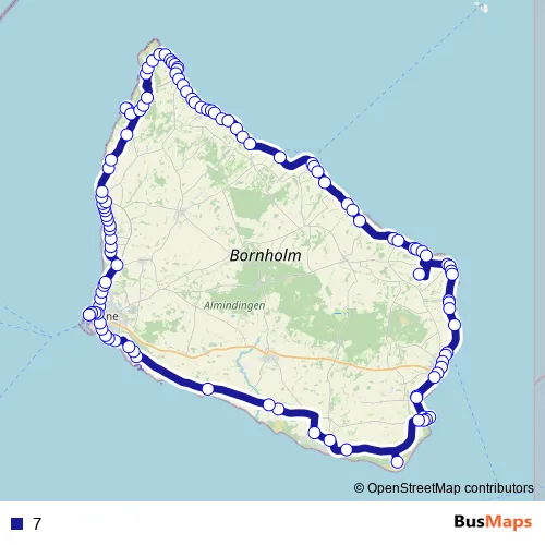 The first stop of the 7 bus route is Rønne Havn (Bornholm) and the last stop is Rønne Havn (Bornholm). 7 is operational during everyday.