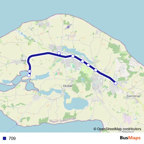 The first stop of the 709 bus route is Dyvig, Dyvig Bådelaug and the last stop is Havnbjerg, Grønvej v Nordborgvej. 709 is operational during everyday.