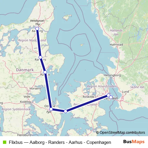 The first stop of the Flixbus bus route is Aalborg and the last stop is Copenhagen Airport (Kastrup), CPH Airport. Flixbus (Aalborg - Randers - Aarhus - Copenhagen) is operational during on weekends.