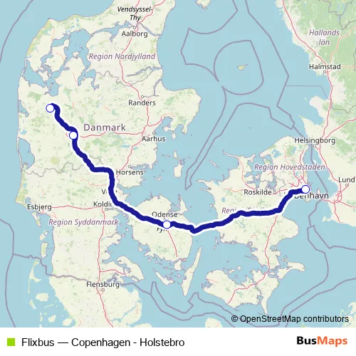 The first stop of the Flixbus bus route is Copenhagen Bus Terminal and the last stop is Holstebro Trafikterminal. Flixbus (Copenhagen - Holstebro) is operational during everyday.