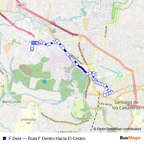 The first stop of the F Dent bus route is Parada 1 - Ruta F - Ana M Segredo Y Calle 57 and the last stop is Parada 57 - Ruta F - Avenida 27 De Febrero. F Dent (Ruta F Dentro Hacia El Centro) is operational during everyday.