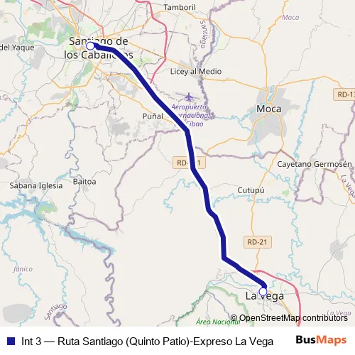The first stop of the Int 3 bus route is Terminal Santiago (Quinto Patio) 1 and the last stop is Terminal Expreso La Vega 1. Int 3 (Ruta Santiago (Quinto Patio)-Expreso La Vega) is operational during everyday.