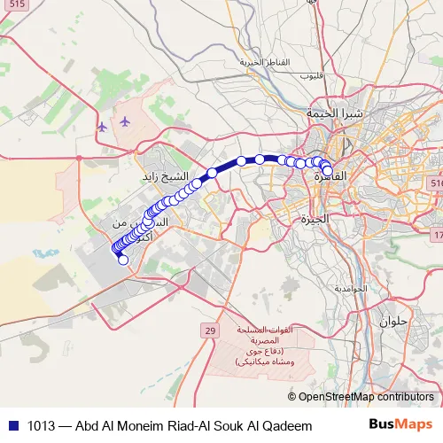 The first stop of the 1013 bus route is Al Souk Al Qadeem and the last stop is Abd Al Moneim Riad. 1013 (Abd Al Moneim Riad-Al Souk Al Qadeem) is operational during everyday.