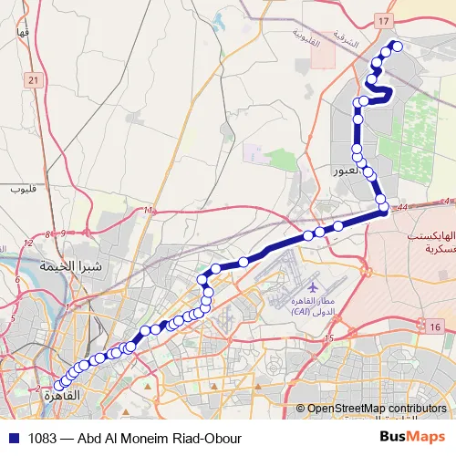 The first stop of the 1083 bus route is Abd Al Moneim Riad and the last stop is Obour. 1083 (Abd Al Moneim Riad-Obour) is operational during everyday.