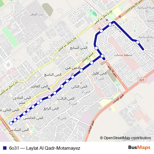 The first stop of the 6o31 bus route is Laylat Al Qadr and the last stop is Blue Bells School - Al Motamayez. 6o31 (Laylat Al Qadr-Motamayez) is operational during everyday.