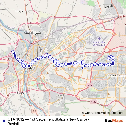 The first stop of the CTA 1012 bus route is Bashtil and the last stop is Higher Institute Of Marketing Commerce & Information Systems. CTA 1012 (1st Settlement Station (New Cairo) - Bashtil) is operational during everyday.