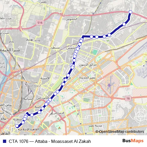 The first stop of the CTA 1076 bus route is Moasasset Al Zakah and the last stop is Ataba. CTA 1076 (Attaba - Moassaset Al Zakah) is operational during everyday.