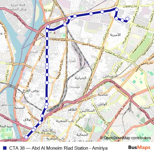 The first stop of the CTA 38 bus route is Amiriyyah and the last stop is Abd Al Moneim Riad. CTA 38 (Abd Al Moneim Riad Station - Amiriya) is operational during everyday.