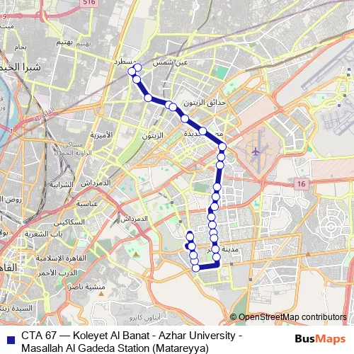 The first stop of the CTA 67 bus route is Massalah Gadeeda (Al Matareyya) and the last stop is Koleyet Al Banat (Azhar University). CTA 67 (Koleyet Al Banat - Azhar University - Masallah Al Gadeda Station (Matareyya)) is operational during everyday.