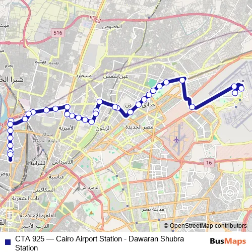The first stop of the CTA 925 bus route is Cairo Airport and the last stop is Al Sahel Police Department. CTA 925 (Cairo Airport Station - Dawaran Shubra Station) is operational during everyday.