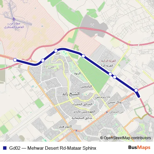 The first stop of the Gd02 bus route is Sphinx Airport and the last stop is Al Mehwar Desert Road. Gd02 (Mehwar Desert Rd-Mataar Sphinx) is operational during everyday.