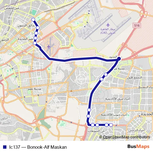 The first stop of the Ic137 bus route is Bank Area (Bonook) - 5th Settlement and the last stop is Alf Maskan. Ic137 (Bonook-Alf Maskan) is operational during everyday.