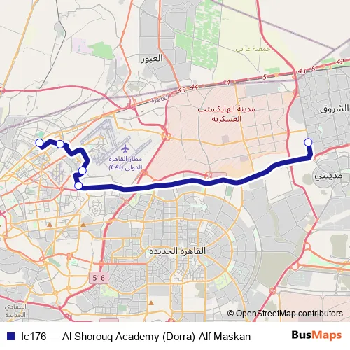 The first stop of the Ic176 bus route is Al Shorouq Academy (Dorra) and the last stop is Alf Maskan. Ic176 (Al Shorouq Academy (Dorra)-Alf Maskan) is operational during everyday.