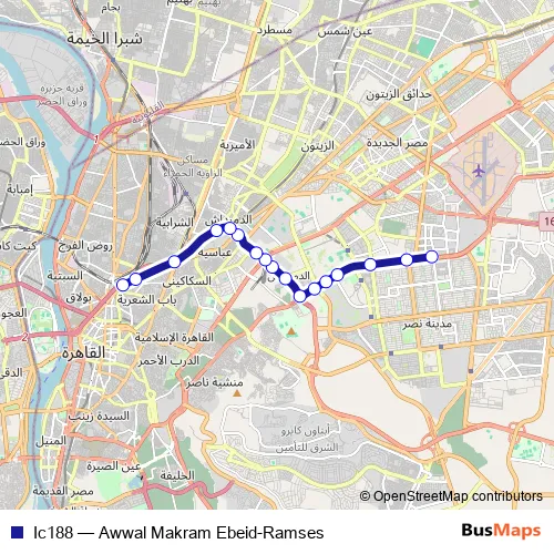 The first stop of the Ic188 bus route is Awwal Makram Ebeid and the last stop is Ramses Railway Station. Ic188 (Awwal Makram Ebeid-Ramses) is operational during everyday.