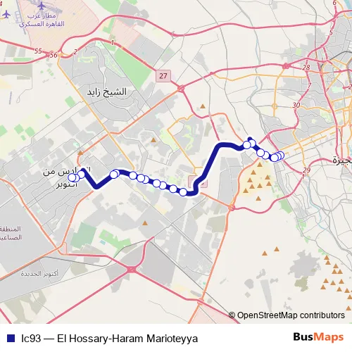 The first stop of the Ic93 bus route is Haram Marioteya and the last stop is Al Hossary Station. Ic93 (El Hossary-Haram Marioteyya) is operational during everyday.