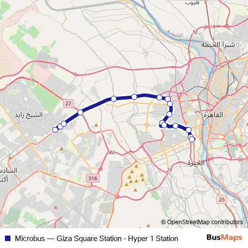 The first stop of the Microbus bus route is Ceramica Cleopatra (Sheikh Zayed) and the last stop is Giza Metro. Microbus (Giza Square Station - Hyper 1 Station) is operational during everyday.