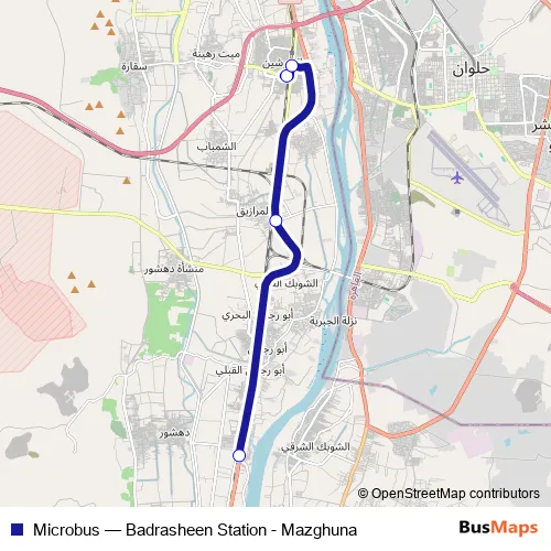 The first stop of the Microbus bus route is Badrasheen Bus Station and the last stop is Mazghuna. Microbus (Badrasheen Station - Mazghuna) is operational during everyday.