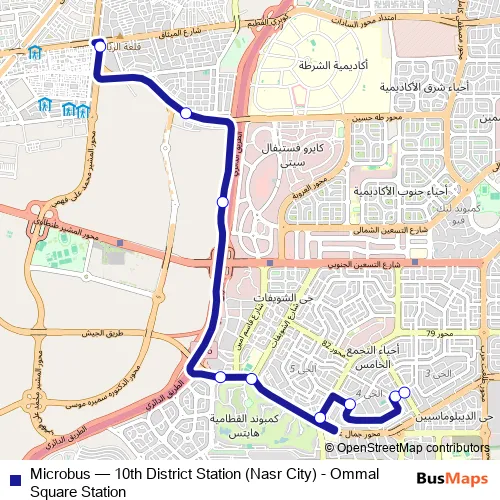 The first stop of the Microbus bus route is 10th District (Nasr City) and the last stop is Ommal Square (5th Settlement). Microbus (10th District Station (Nasr City) - Ommal Square Station) is operational during everyday.