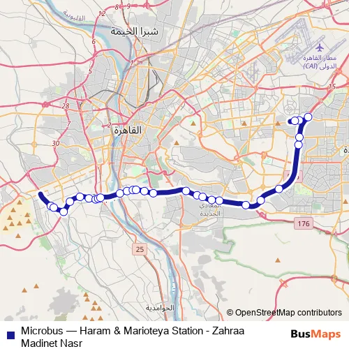 The first stop of the Microbus bus route is Al Magzar (Al Mariouteya) and the last stop is Zahraa Nasr City. Microbus (Haram & Marioteya Station - Zahraa Madinet Nasr) is operational during everyday.