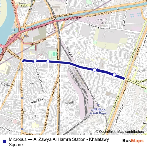 The first stop of the Microbus bus route is Khalafawi Square and the last stop is Manshiyat Al Gamal. Microbus (Al Zawya Al Hamra Station - Khalafawy Square) is operational during everyday.