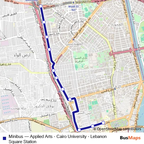 The first stop of the Minibus bus route is Faculty of Applied Arts (Helwan University) and the last stop is Lebanon Square. Minibus (Applied Arts - Cairo University - Lebanon Square Station) is operational during everyday.