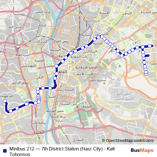 The first stop of the Minibus 212 bus route is 7th District (Nasr City) and the last stop is Kafr Tuhurmis. Minibus 212 (7th District Station (Nasr City) - Kafr Tohormos) is operational during everyday.