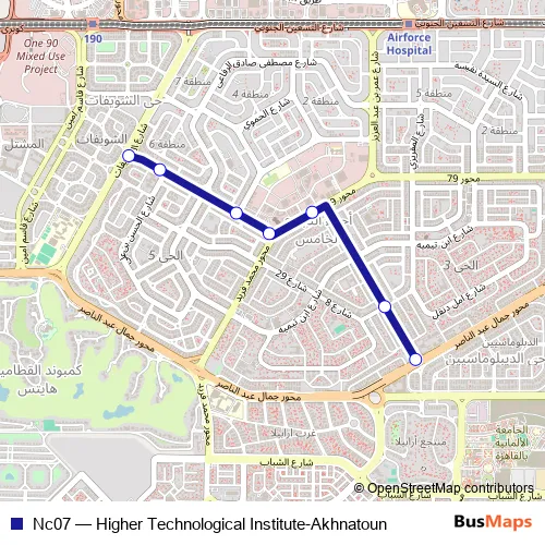 The first stop of the Nc07 bus route is Akhnaton Square and the last stop is Higher Technological Institute - 5th Settlement. Nc07 (Higher Technological Institute-Akhnatoun) is operational during everyday.