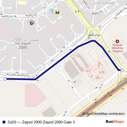 The first stop of the Sz03 bus route is Gate 3 - Zayed 2000 and the last stop is Zayed 2000. Sz03 (Zayed 2000-Zayed 2000 Gate 3) is operational during everyday.