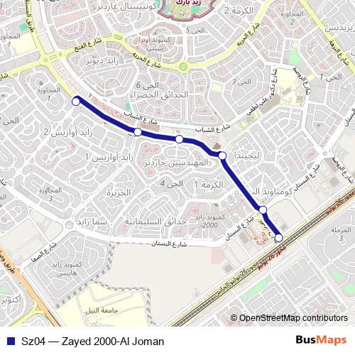 The first stop of the Sz04 bus route is Zayed 2000 and the last stop is Al Juman. Sz04 (Zayed 2000-Al Joman) is operational during everyday.