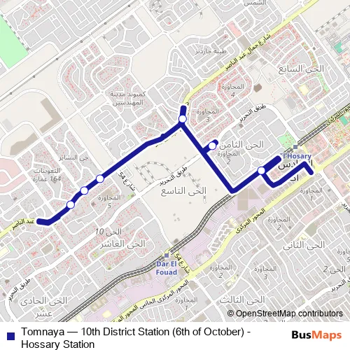 The first stop of the Tomnaya bus route is Kheir Zaman Al Mehwar Al Markazi (6th of October) and the last stop is Kawkab Al Sharq Cafe - Bashayer. Tomnaya (10th District Station (6th of October) - Hossary Station) is operational during everyday.