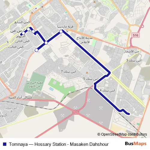 The first stop of the Tomnaya bus route is Hossary Station and the last stop is Al Motamayez Wahat Entrance 2. Tomnaya (Hossary Station - Masaken Dahshour) is operational during everyday.